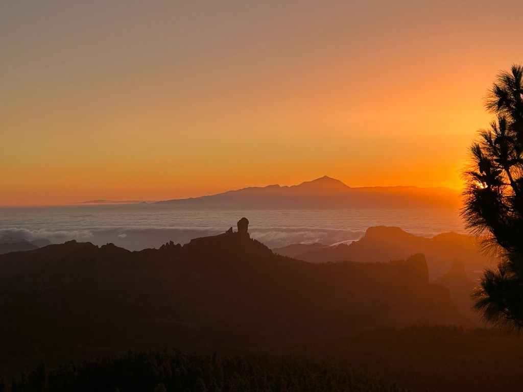 Roque Noblo on the island of Gran Canary. Mt. Tiede, 12,200′ on the island of Tenerife can be seen in the background. July 2025